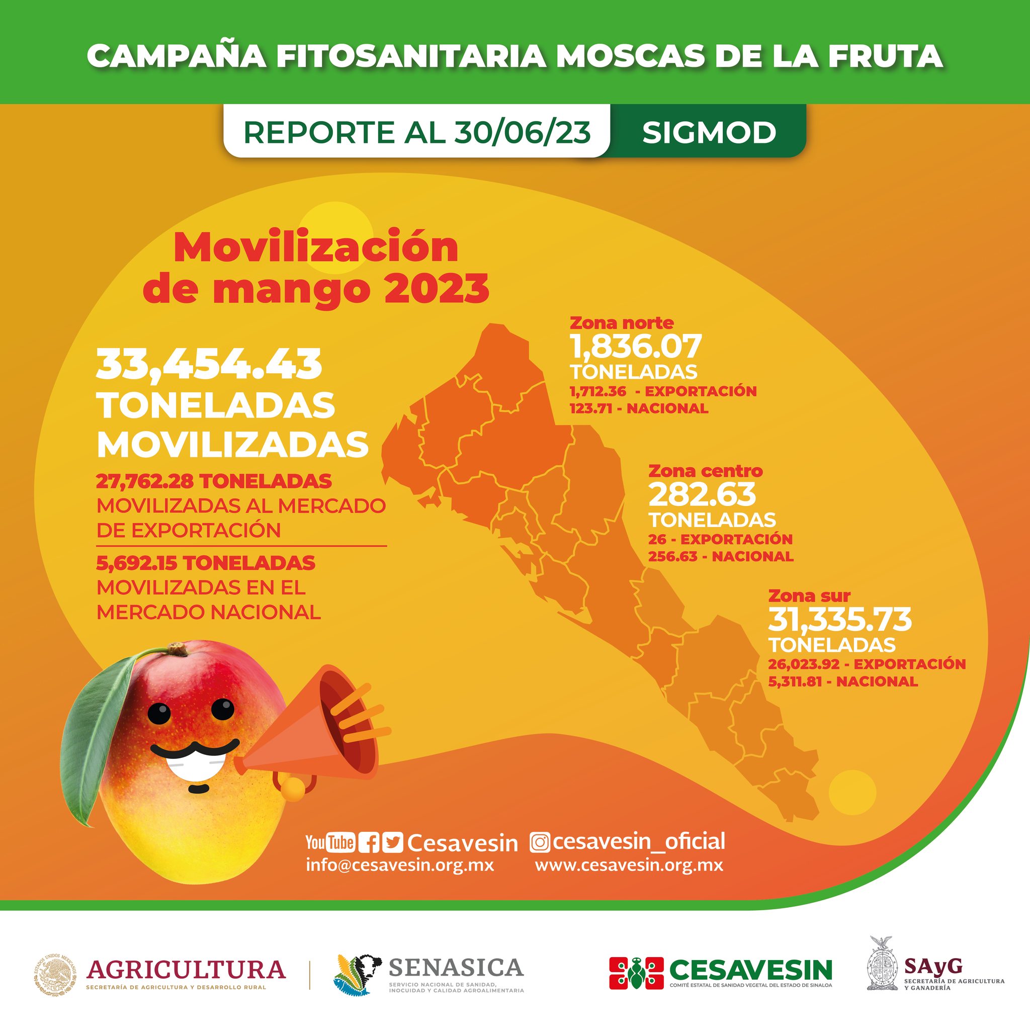 Sinaloa, martes 11 de julio de 2023.- El Comité Estatal de Sanidad Vegetal del Estado de Sinaloa (Cesavesin), presidido por Abraham Bello Esquivel, informa en sus redes sociales sobre los resultados positivos obtenidos en la movilización de toneladas de mango durante el primer semestre del año, según el Sistema para la Gestión de Documentos y Operaciones de Campo (SIGMOD).